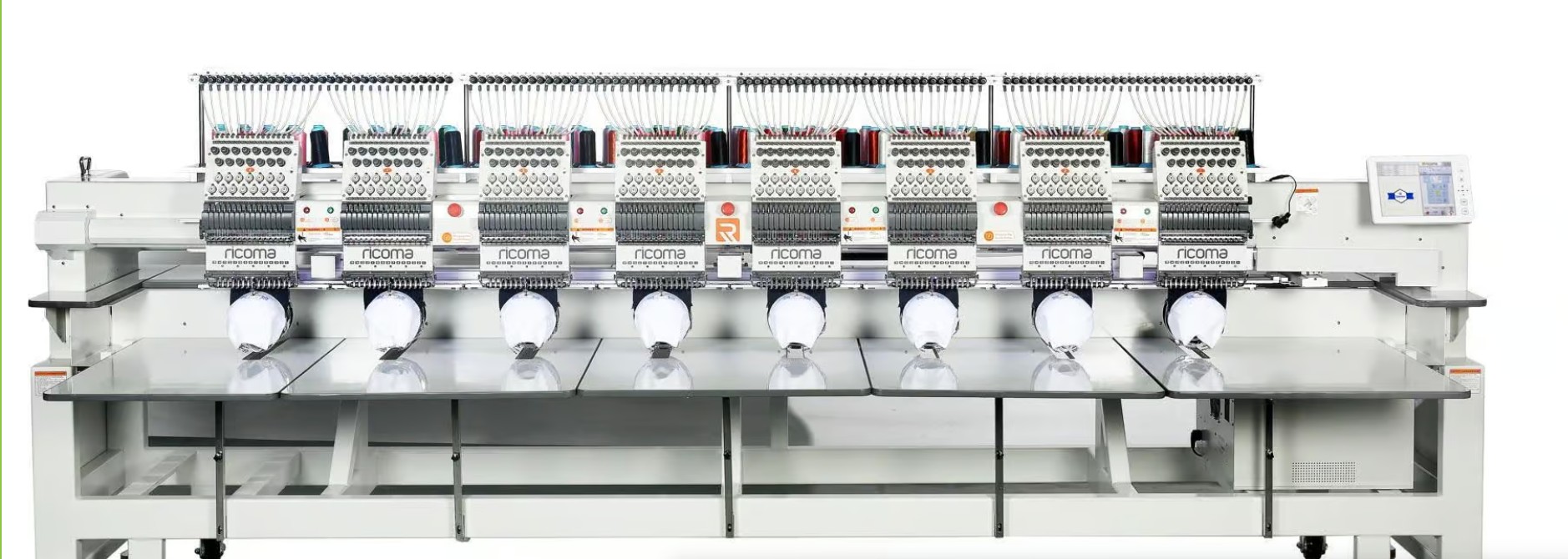 Máquina de bordar ocho cabezas, 12 hilos con un área de bordado de 45x45cm. Pensada para volúmenes de trabajo.